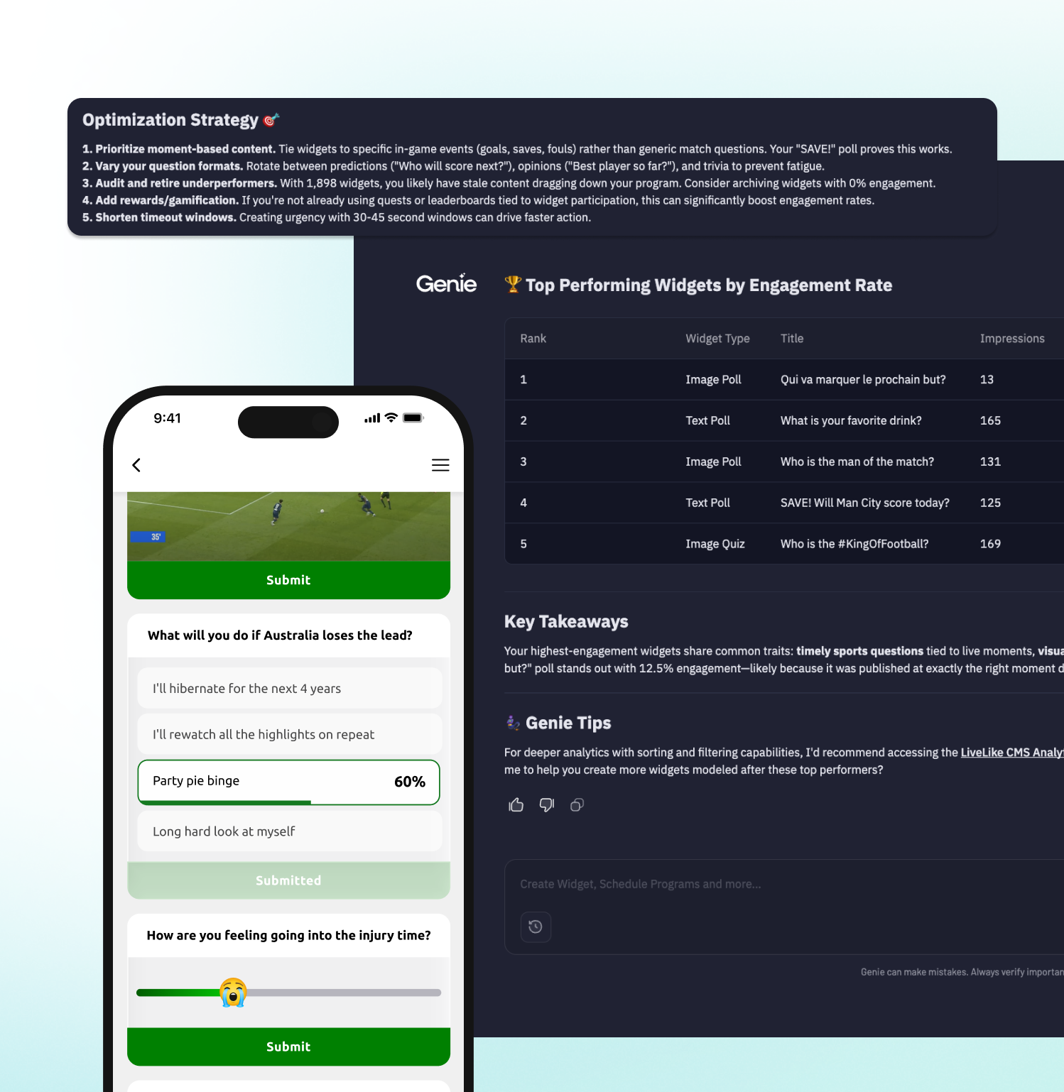 Your team spends hours writing quiz questions, creating polls, and coordinating campaign launches. LiveLike Genie does the time-consuming tasks so your team can focus on strategy.